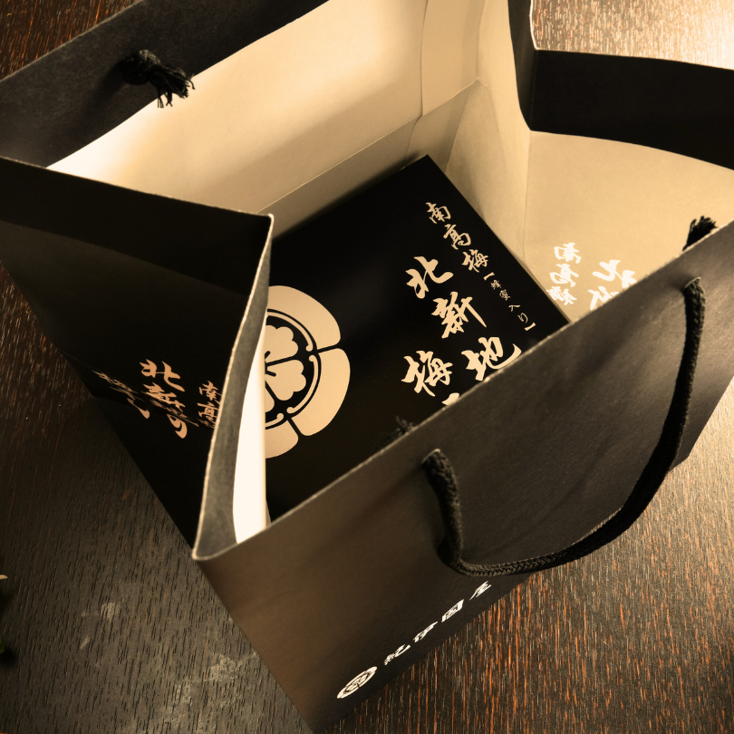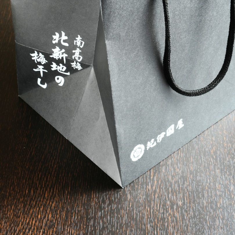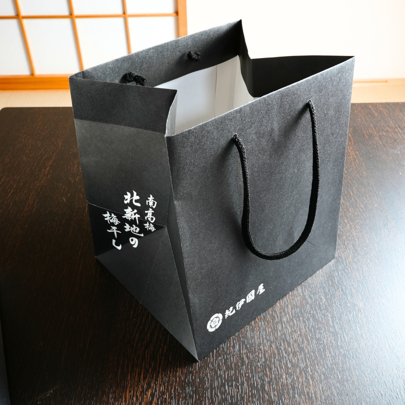 「北新地の梅干し」が3つ入るオリジナル手提げ袋。黒をベースとしたシックな色調なので、贈答品用に最適な袋となっております。